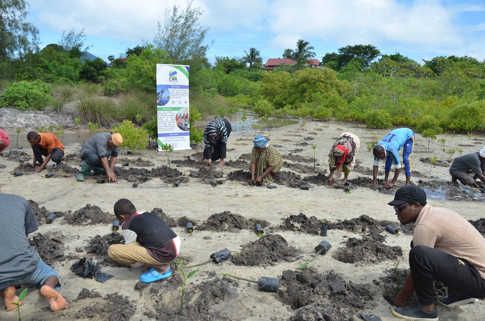 CAN Tanzania and community members participating in planting the mangroves grown from the previously established tree nursery