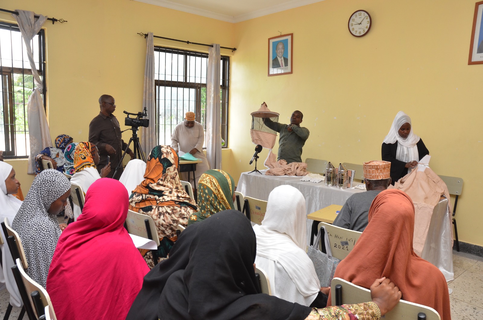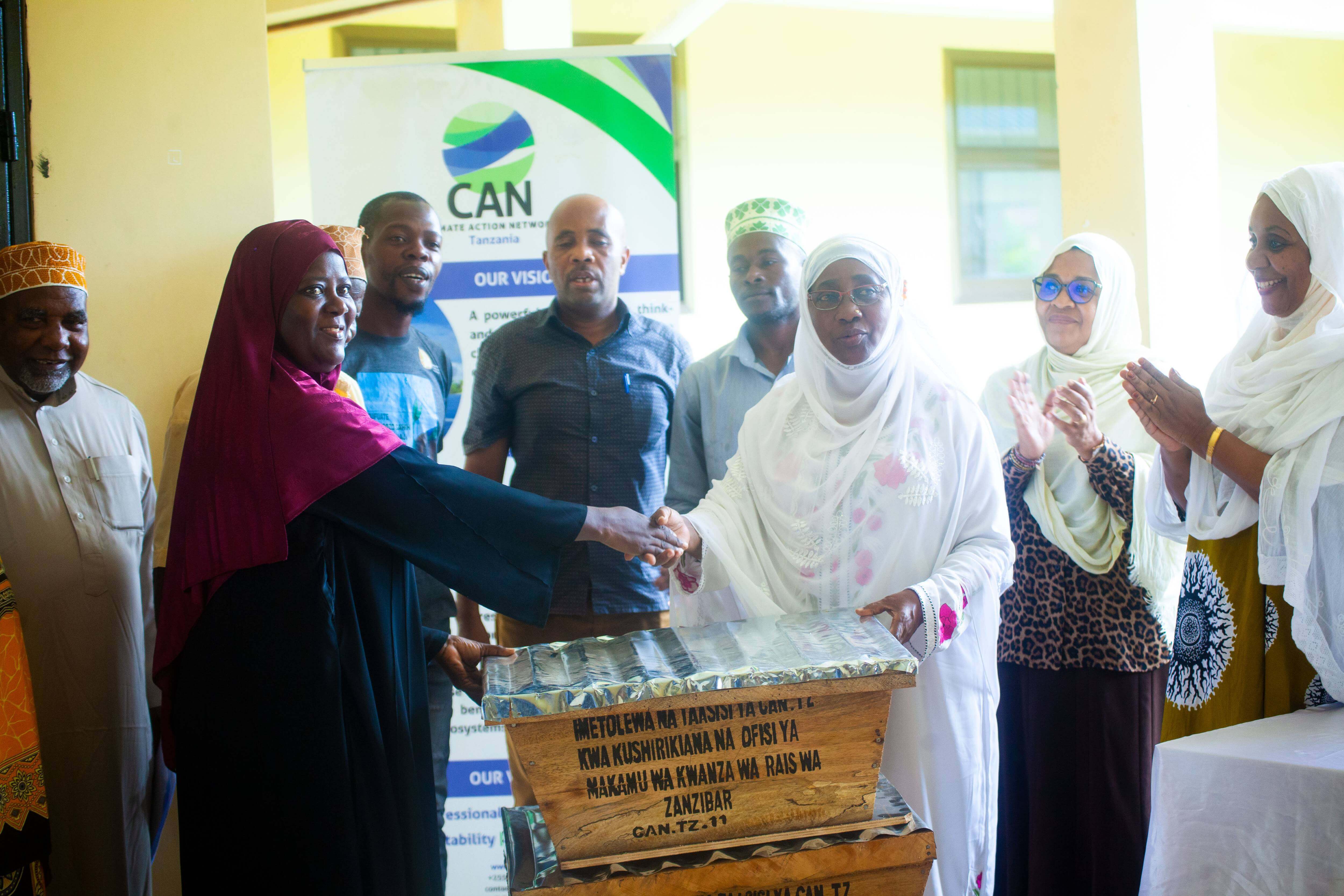 Hon. Harusi Saidi Suleiman, Minister of State, Office of the First Vice President of Zanzibar, handling beehives to a Chuini community member as part of livelihood diversification initiatives facilitated by CAN Tanzania in Chuini.jpg